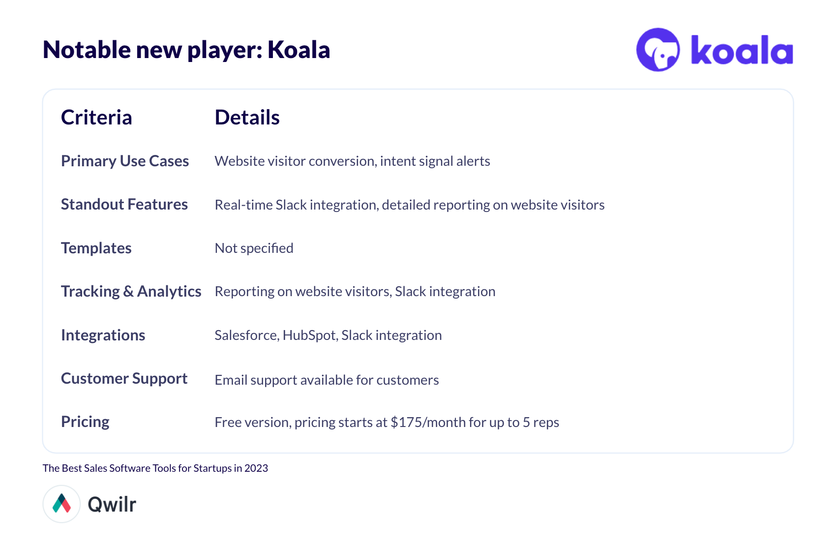 Pricing: Koala offers a free version for startups still looking to understand product-market fit. For smaller teams (up to 5 reps) pricing starts at $175 per month. Once your team grows beyond five reps, you’ll need to contact Koala’s sales team for custom pricing information.