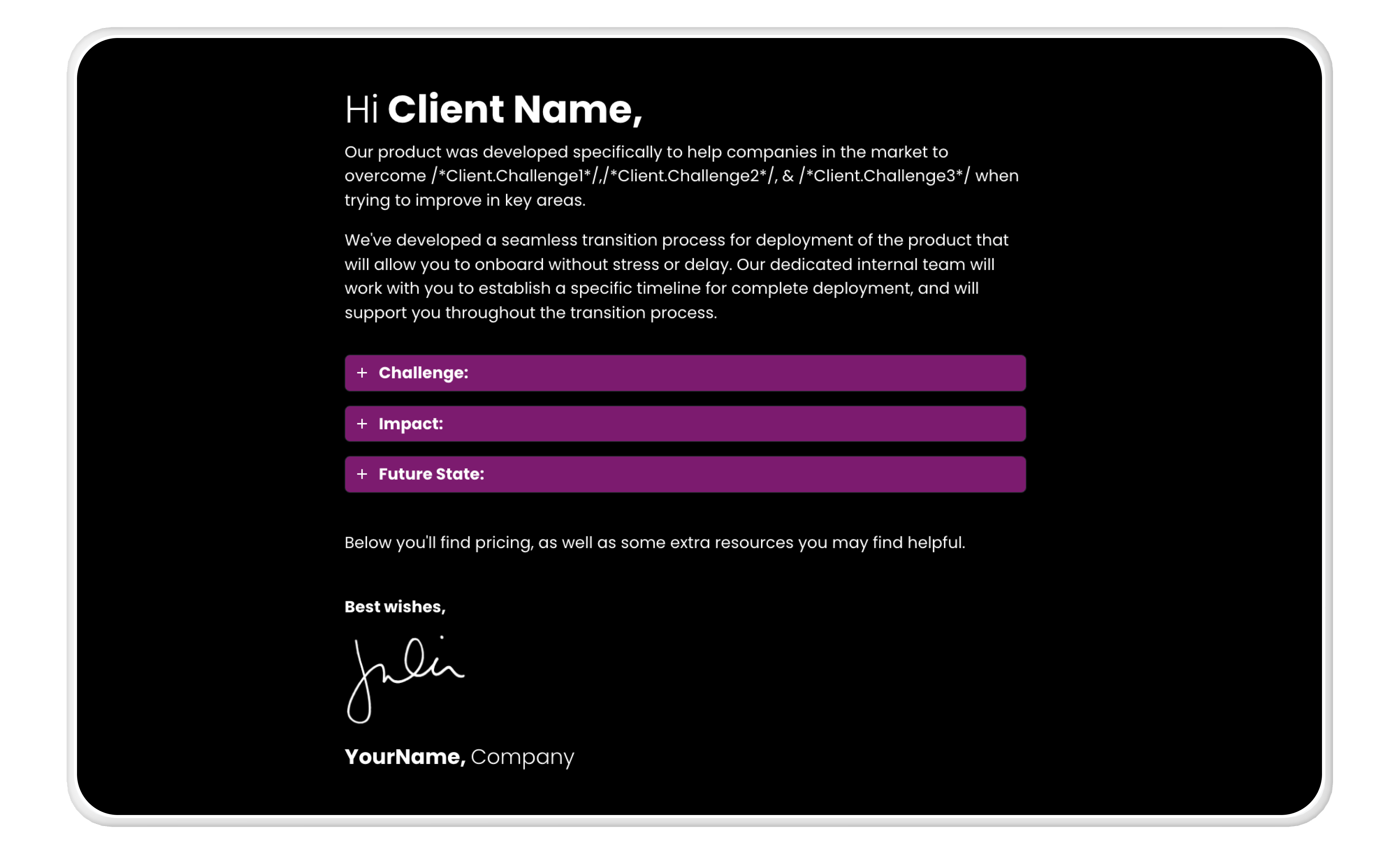 Take some inspiration from Qwilr’s account executive, Sydney Youngblood who “drops in a Loom video walking through pricing and personalizes notes to the customer.”