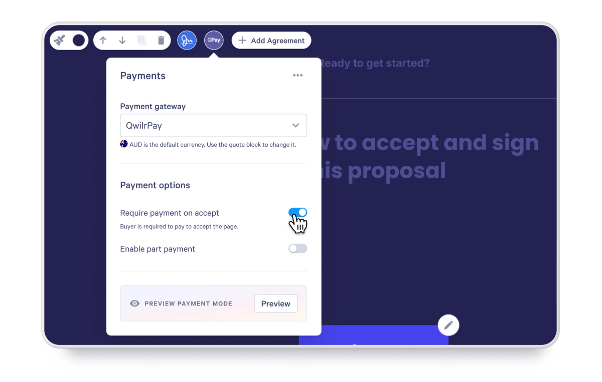 QwilrPay puts professional payment tools right where you need them – inside your Qwilr proposals and quotes.