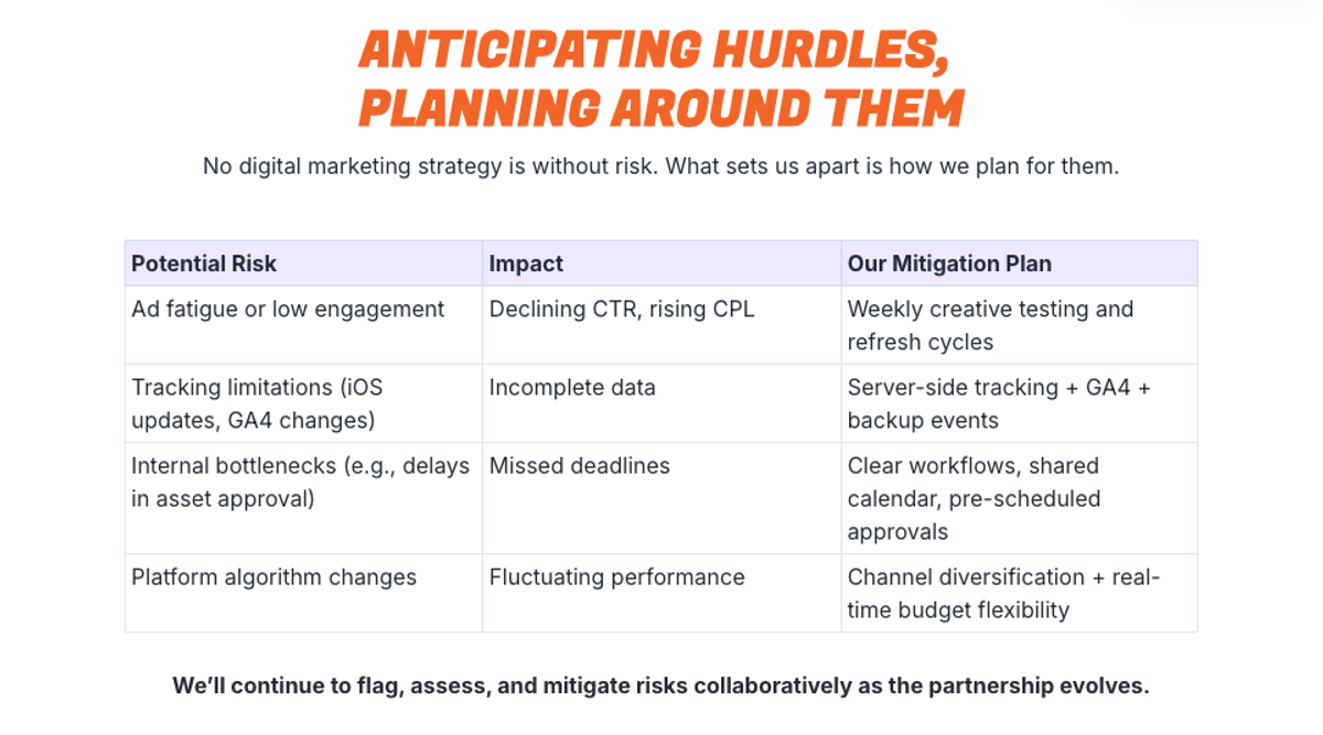 Clients appreciate honesty and foresight. This section of the digital marketing proposal template is built to show that you’ve thought through common challenges and have strategies in place to mitigate them. The content is already framed to reassure clients while demonstrating your proactivity. Customize with specifics from the client’s vertical or budget level, but lean on the structure to communicate professionalism and reduce hesitation.